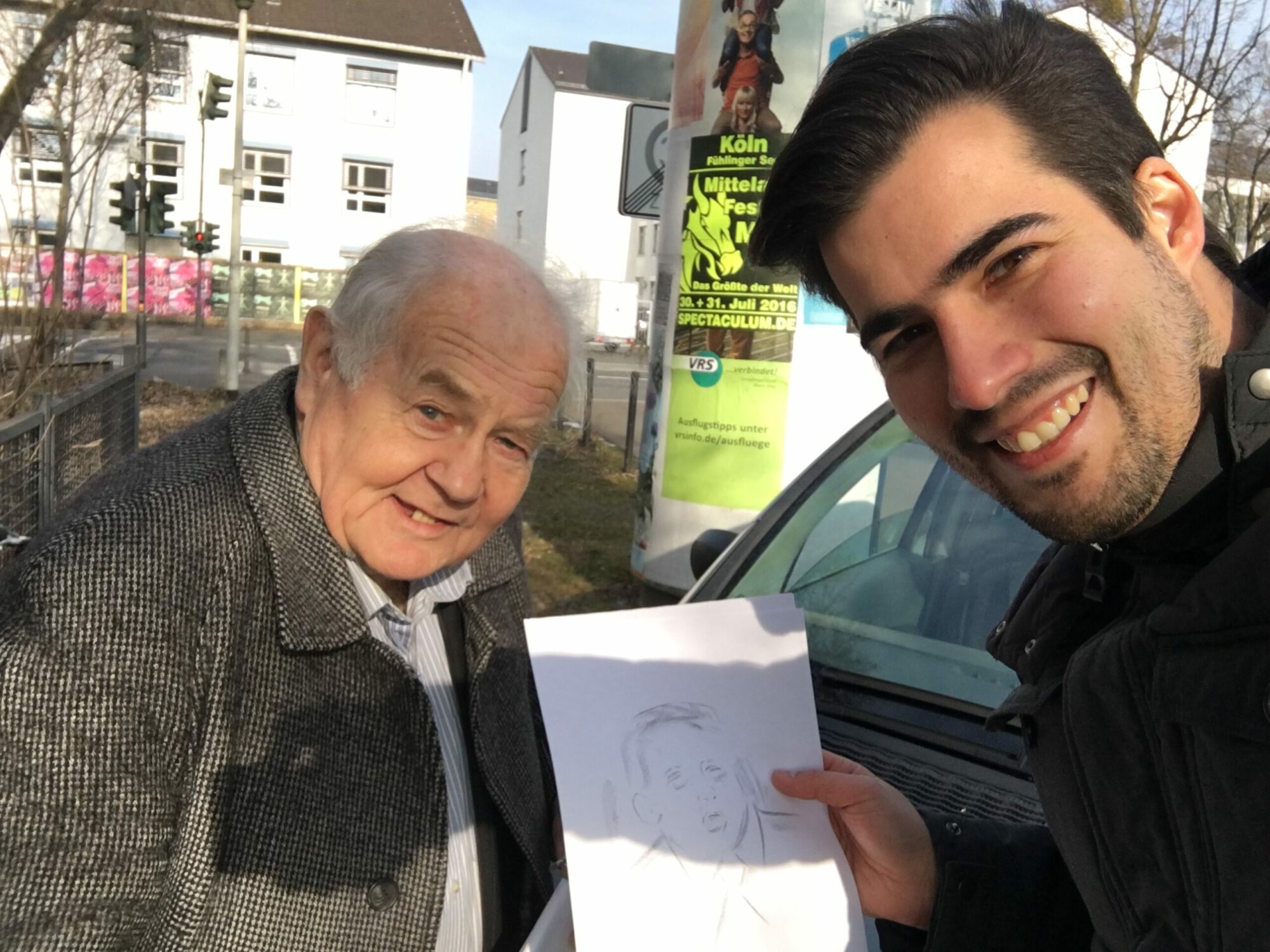 Mittags fuhr ich ins Studio. Auf dem Weg begegnete mir noch Jan Loh, bekannt als der Alle-Mal-Malen-Mann. Ich hielt an, erklärte ihm die Geschichte und er malte mir ein Bild für Trump auf der Autohaube. Unglaublich aber wahr! Im Skript stand Jan Loh bereits drin! Jetzt hatte ich also auch das Bild dazu! :)