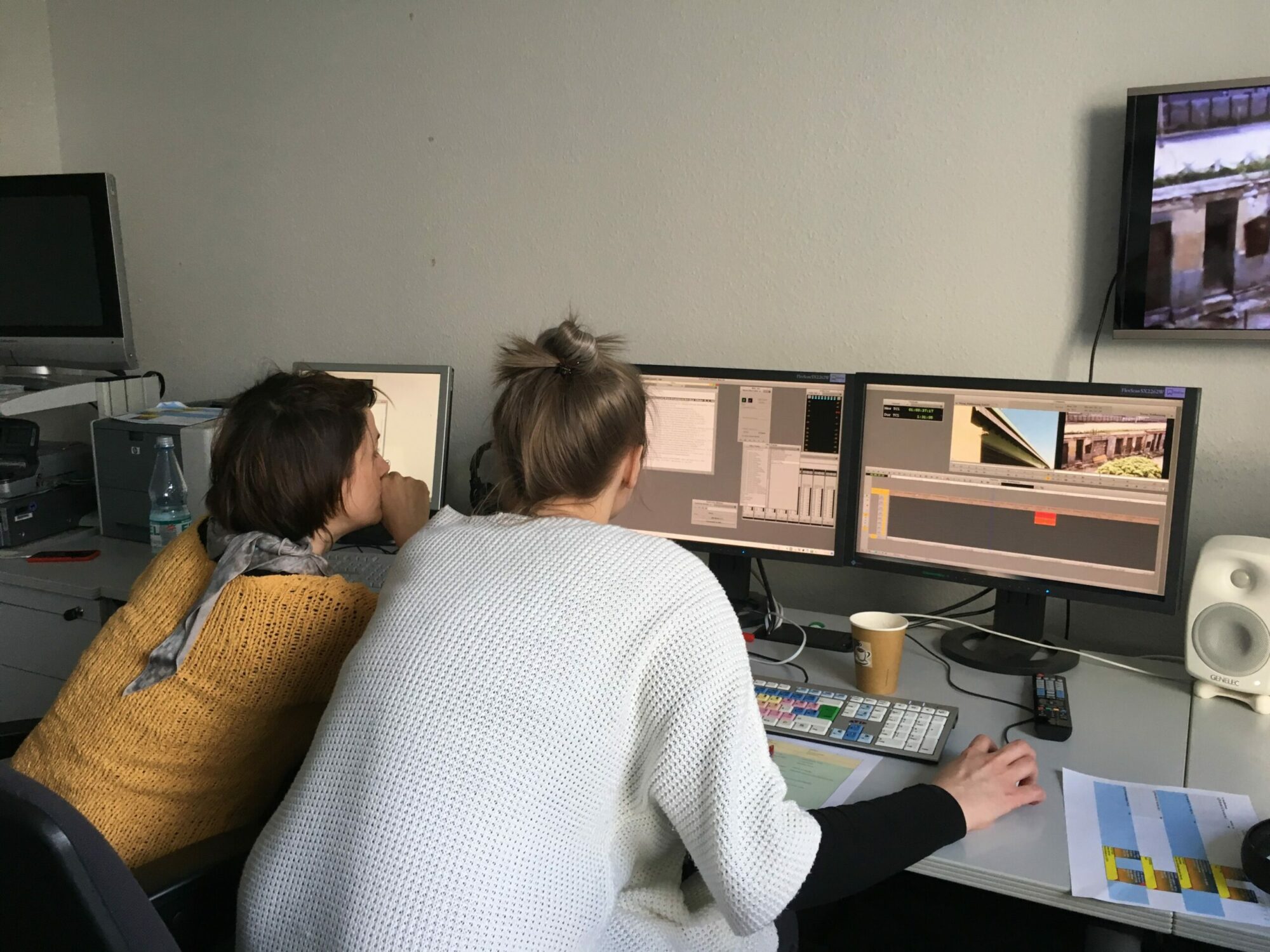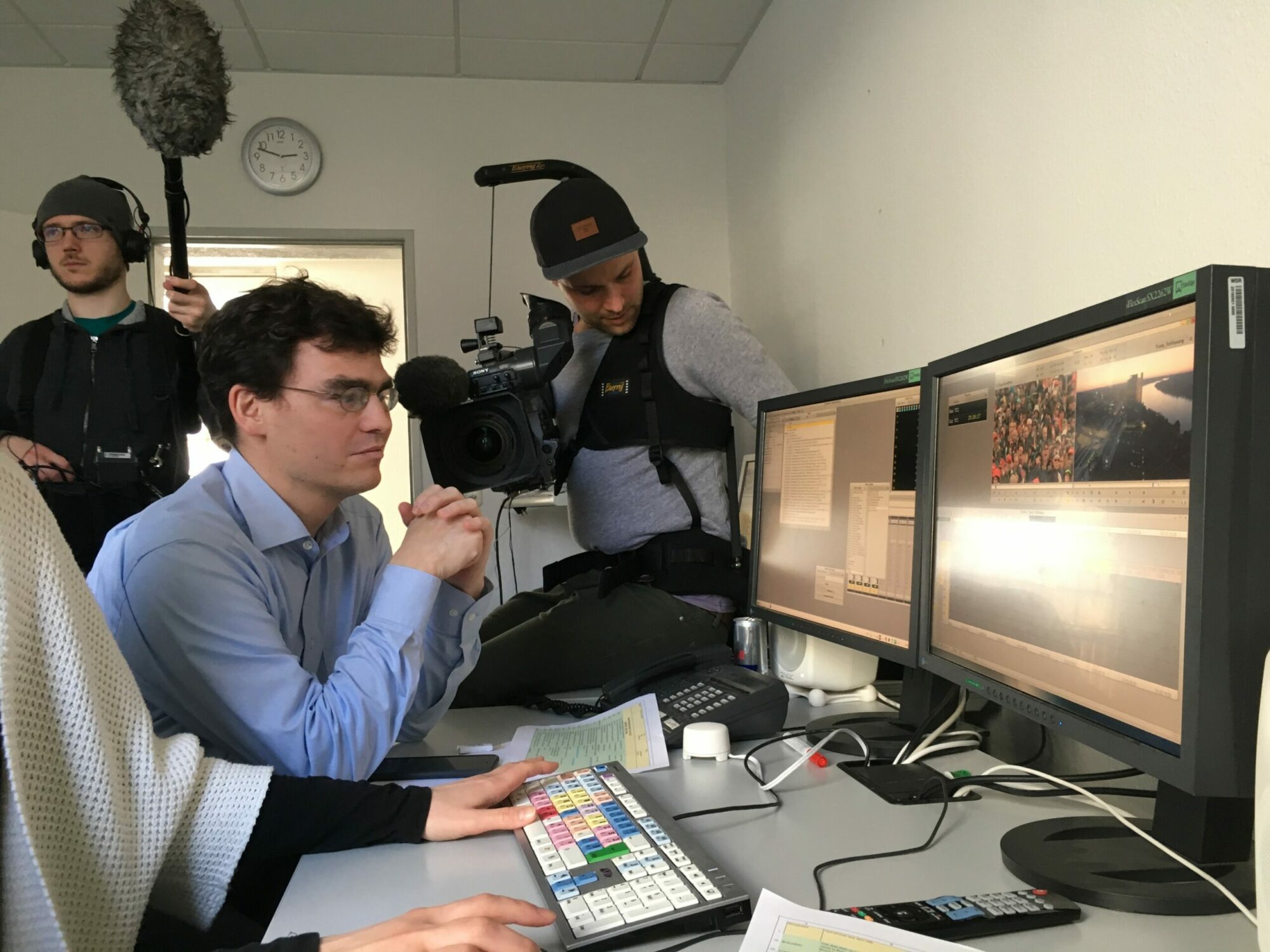 Danach saßen wir drei Stunden am Schnittplatz des WDR, das uns wundervoll mit dem gesamten Archiv-Material und dem Schnitt unterstützte. Ein Sprecher kam und wir nahmen Sprachbeispiele auf. Die Cutterin war unter Strom und gab alles für uns, während des Team immer wieder auch Szenen filmte.